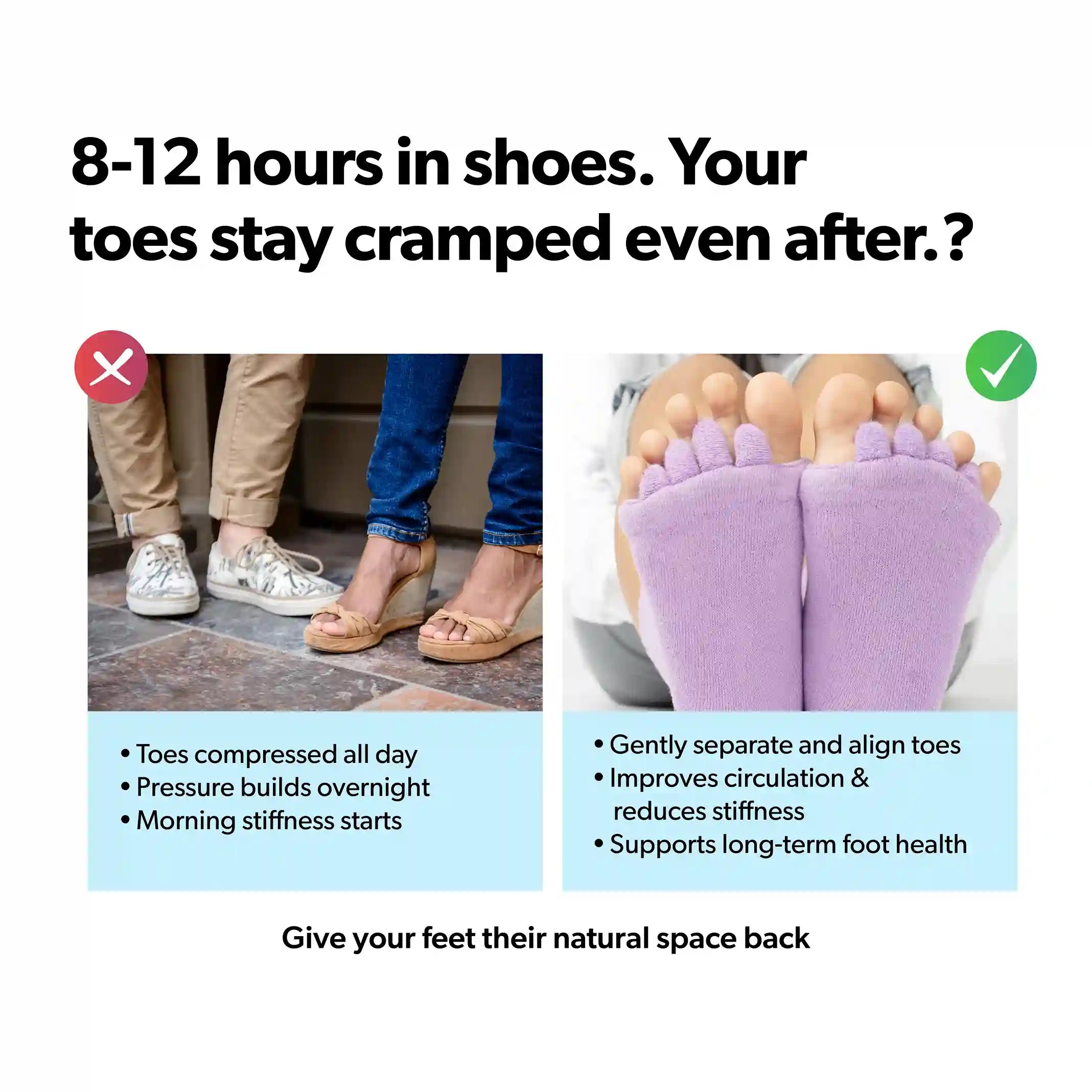The Alignment Socks cater to individuals across all age groups. Whether you spend the day on the go, or simply seek comfort after a regular day, these socks are designed to rejuvenate your feet. By gently opening up the toes, they promote a more natural and relaxed foot posture.