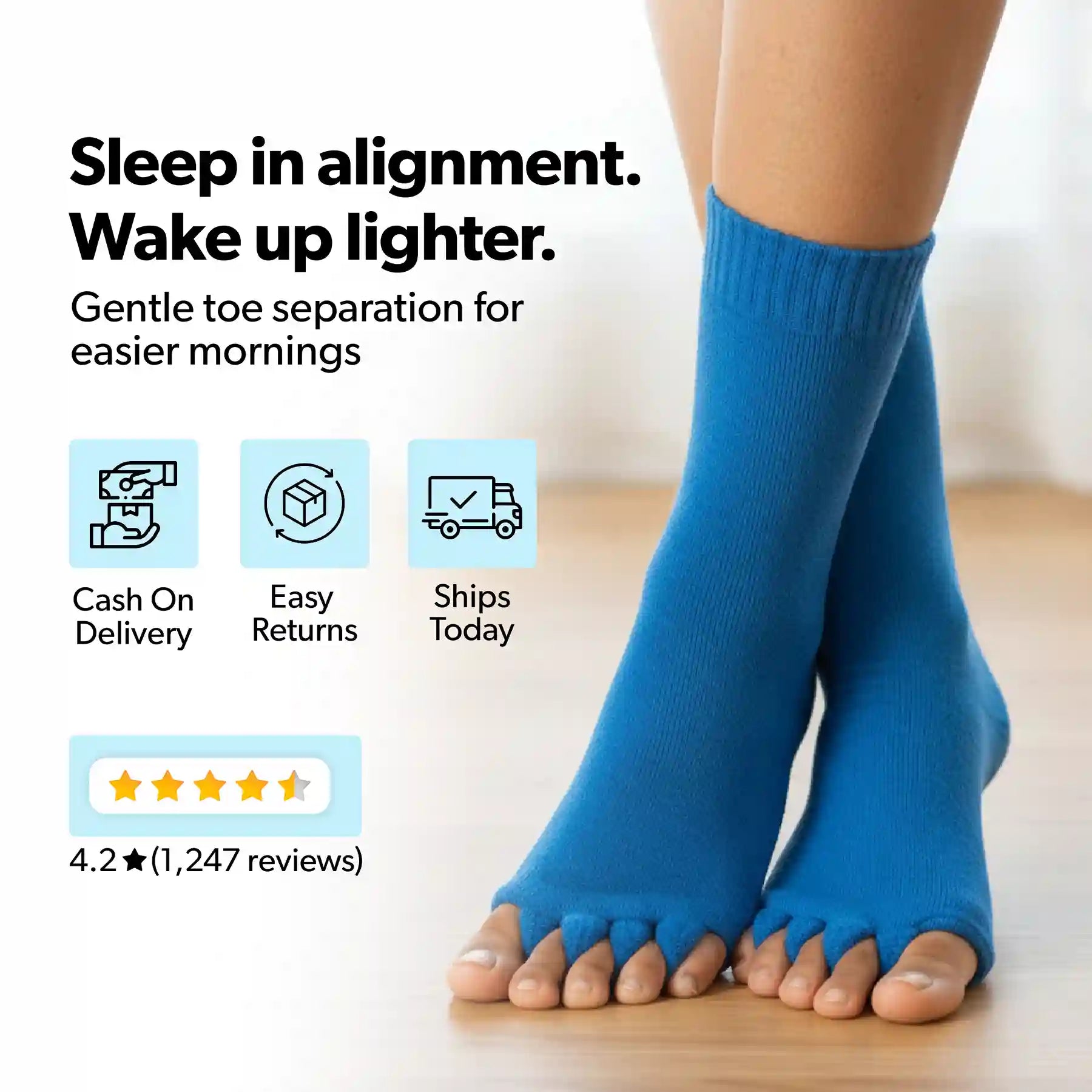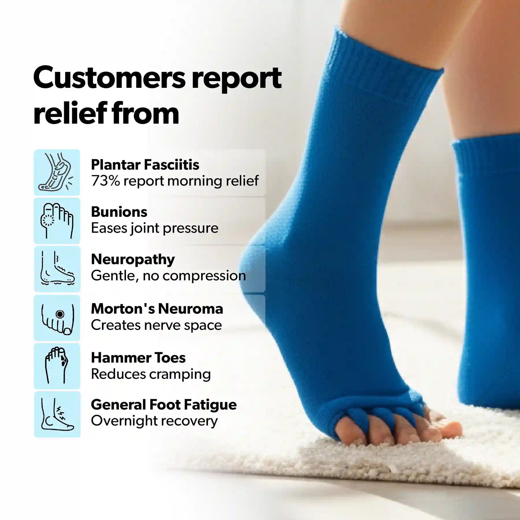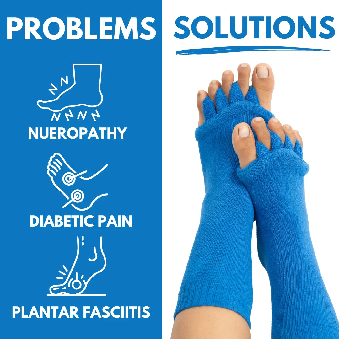 Our Foot Alignment Socks are designed to gently separate and realign toes, helping relieve pain from conditions like bunions and plantar fasciitis. Customers frequently mention noticeable pain relief and enhanced comfort from the targeted support that these socks provide.