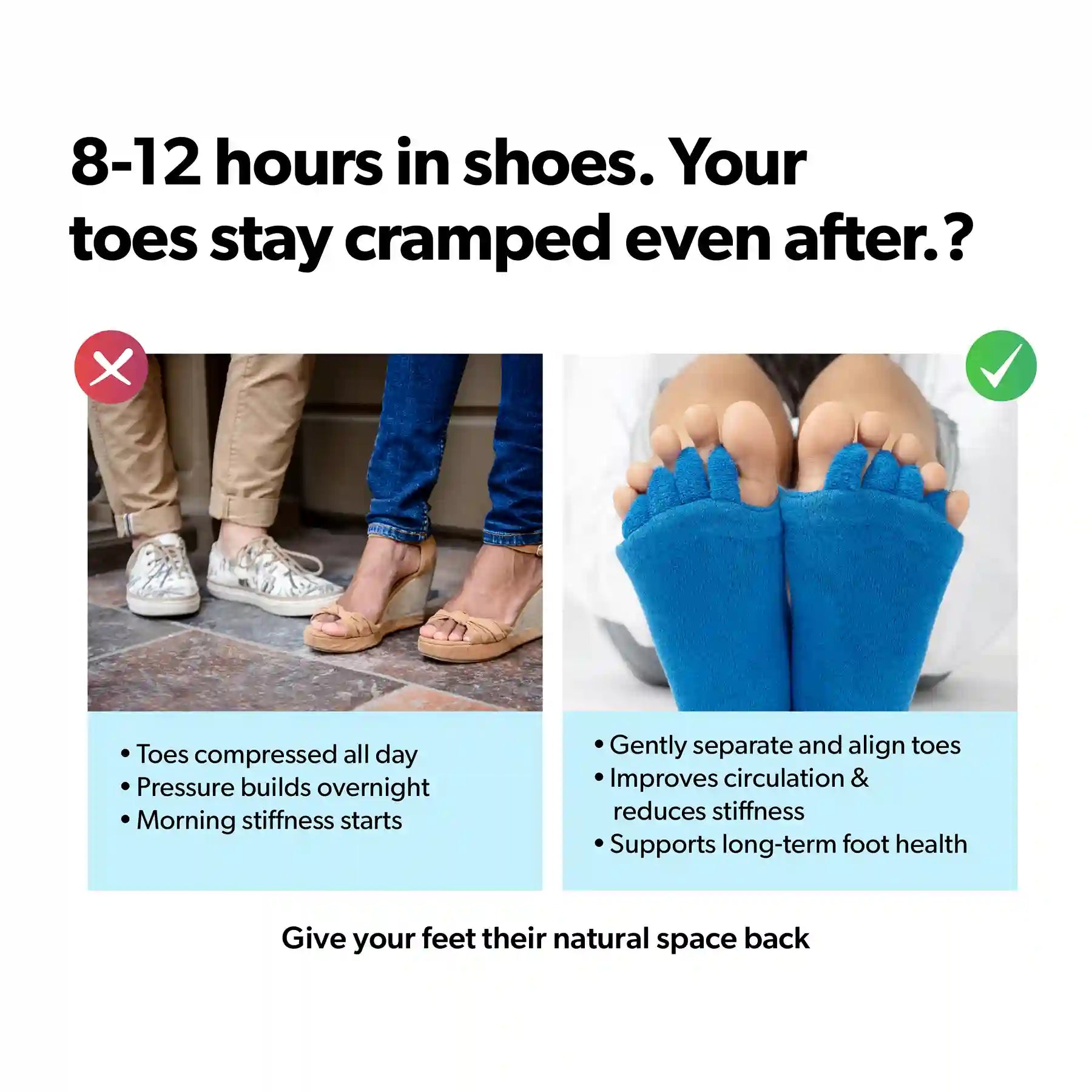 The Alignment Socks cater to individuals across all age groups. Whether you spend the day on the go, or simply seek comfort after a regular day, these socks are designed to rejuvenate your feet. By gently opening up the toes, they promote a more natural and relaxed foot posture.